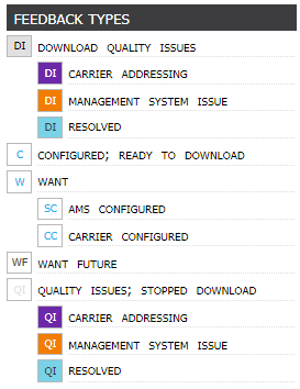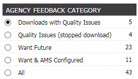Panel. The Feedback list is filtered using the Agency Feedback Category radio buttons. Next to each agency feedback category is a number that represents how many connections in the Feedback list have that agency feedback category. Download with Quality Issues is the default agency feedback category—only connections that contain the Download Quality Issues feedback type display in the Feedback list when this option is selected. You can change this filter by selecting a different option in the Agency Feedback Category section. The All filter displays connections with any type of agency feedback.