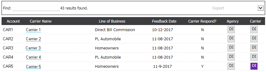 The Feedback list consists of an Account, Carrier Name, Line of Business, Feedback Date, Carrier Respond? (Y or N), Agency (Current Preference), and Carrier (Current Feedback).The connections in the Feedback list are sorted by the Account which is the carrier account code by default; the sort can be changed by clicking on any of the other column headers in the list.