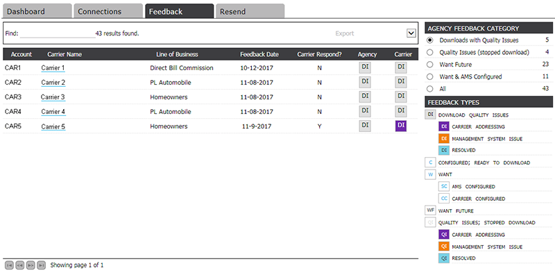 The Feedback tab enables you to view reported issues, your updates to the Connection Report, whether the carrier responded, and your carriers’ feedback in one location. The Feedback tab consists of the Feedback List, Action Panel, Agency Feedback Category filter, and Feedback Types legend. Additionally, carrier updates to your reported quality issues are noted in the weekly Connections Report Changes notification email.